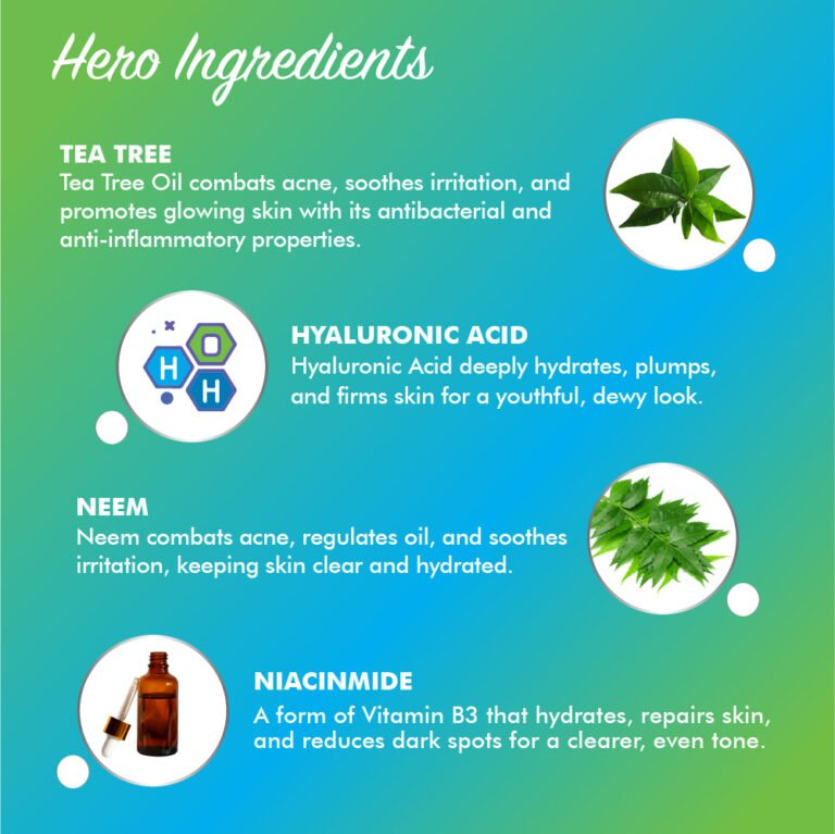 Active Ingredients: Tea Tree Oil, Hyaluronic Acid, Neem Extract, Aloe Vera, Green Tea, Cucumber Extract